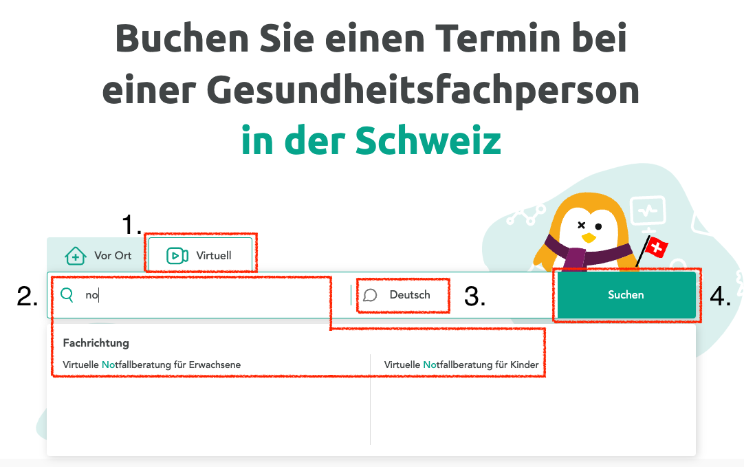 Eine “Notfallberatung per Videosprechstunde” mit einer Fachperson in Allgemeinmedizin oder Pädiatrie können Sie über die Webseite onedoc.ch buchen.