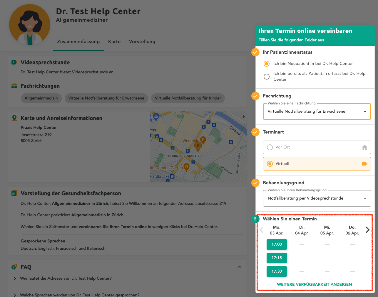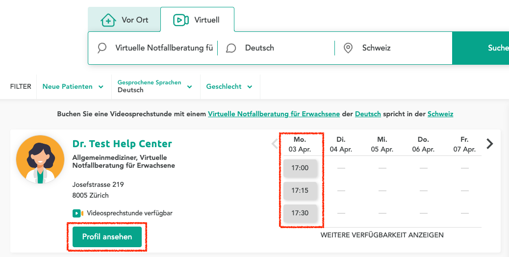 Die “Notfallberatung per Videosprechstunde” kann direkt aus dieser Ansicht gebucht werden oder Sie wählen “Profil ansehen”, um mehr Informationen zur Fachperson zu erfahren.