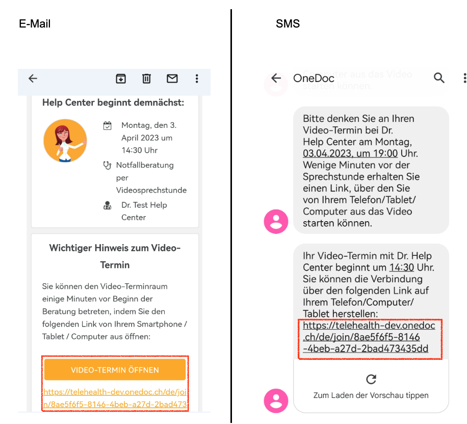 Nach der Buchung einer “Notfallberatung per Videosprechstunde” erhalten Sie eine Terminbestätigung per E-Mail sowie kurz vor Ihrem Termin eine SMS. In beiden Varianten ist ein Link enthalten, mit dem Sie in die Videosprechstunde gelangen.