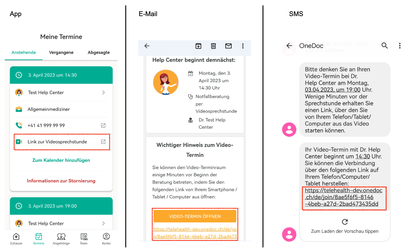 - Maximal zehn Minuten vor der Videosprechstunde können Sie den virtuellen Warteraum betreten. Öffnen Sie dafür den Link in der E-Mailbestätigung, der SMS oder direkt in der OneDoc App.