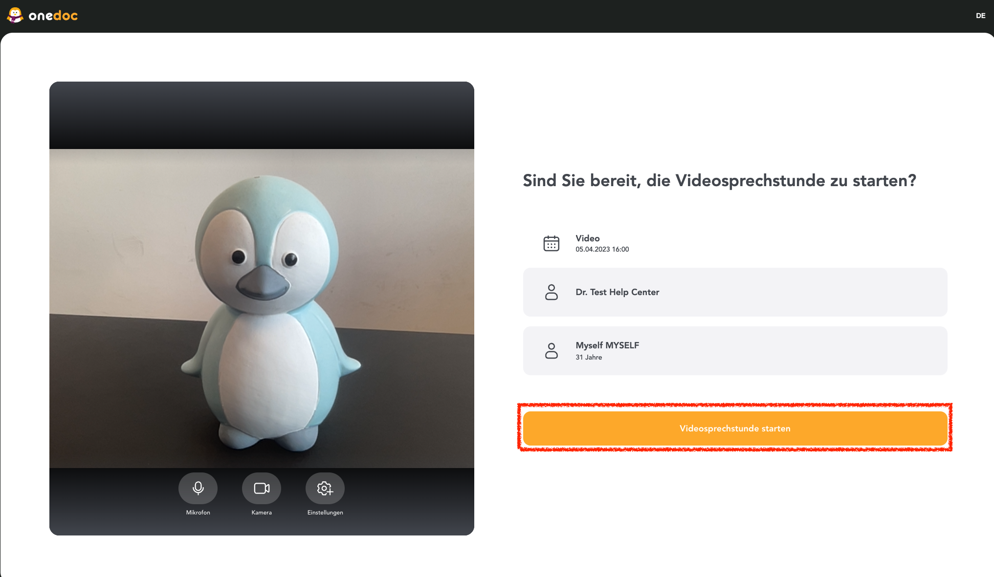 - Bevor Sie die Videosprechstunde starten, befinden Sie sich im virtuellen Warteraum. Hier können Sie das Mikrofon und die Kamera ein/ausstellen und diverse Einstellungen vornehmen. Wenn Sie bereit sind, klicken Sie auf “Videosprechstunde starten”.