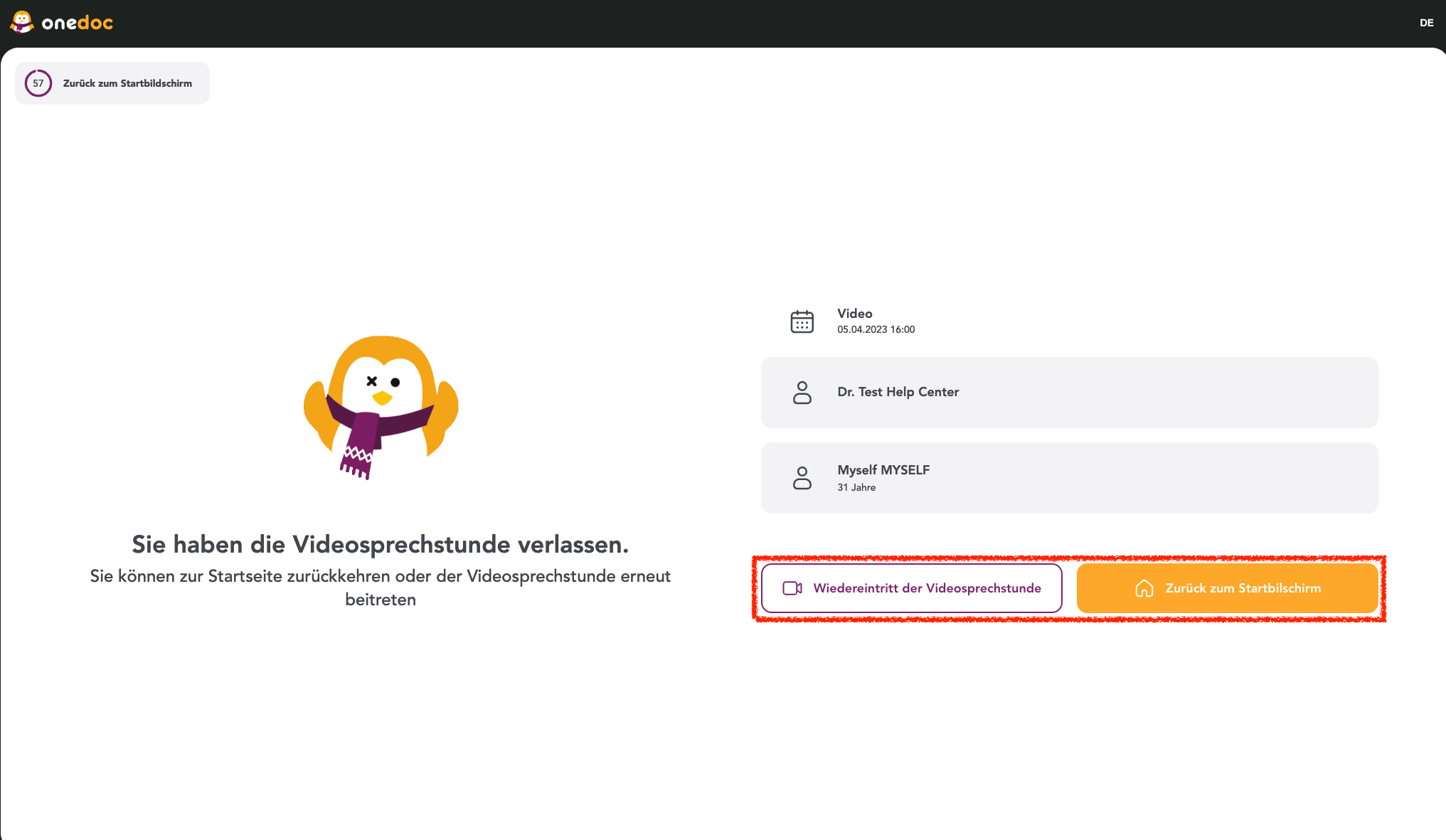 - Beim verlassen der Videosprechstunde haben Sie die Möglichkeit, wieder einzutreten oder zurück zum Startbildschirm zu gelangen.