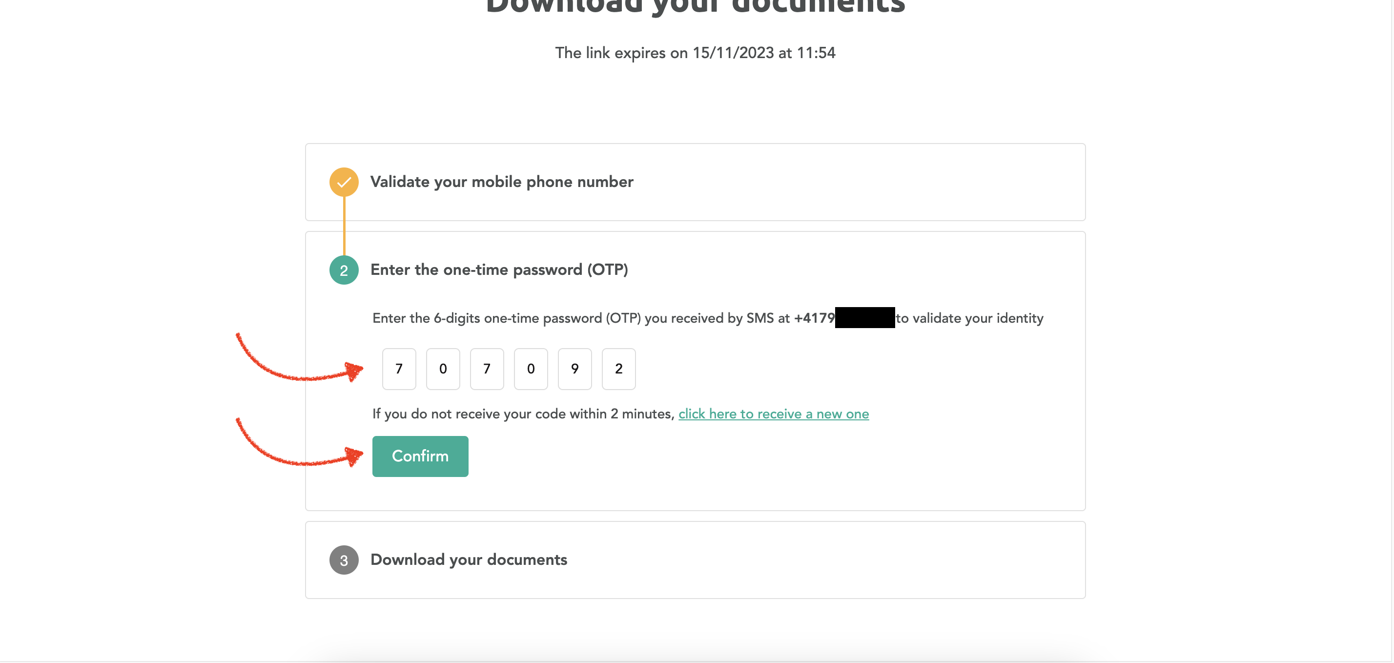 - You will receive a code via SMS within a few seconds. Enter this confirmation code. If you do not receive a code, you can select the "click here to receive a new one" option.