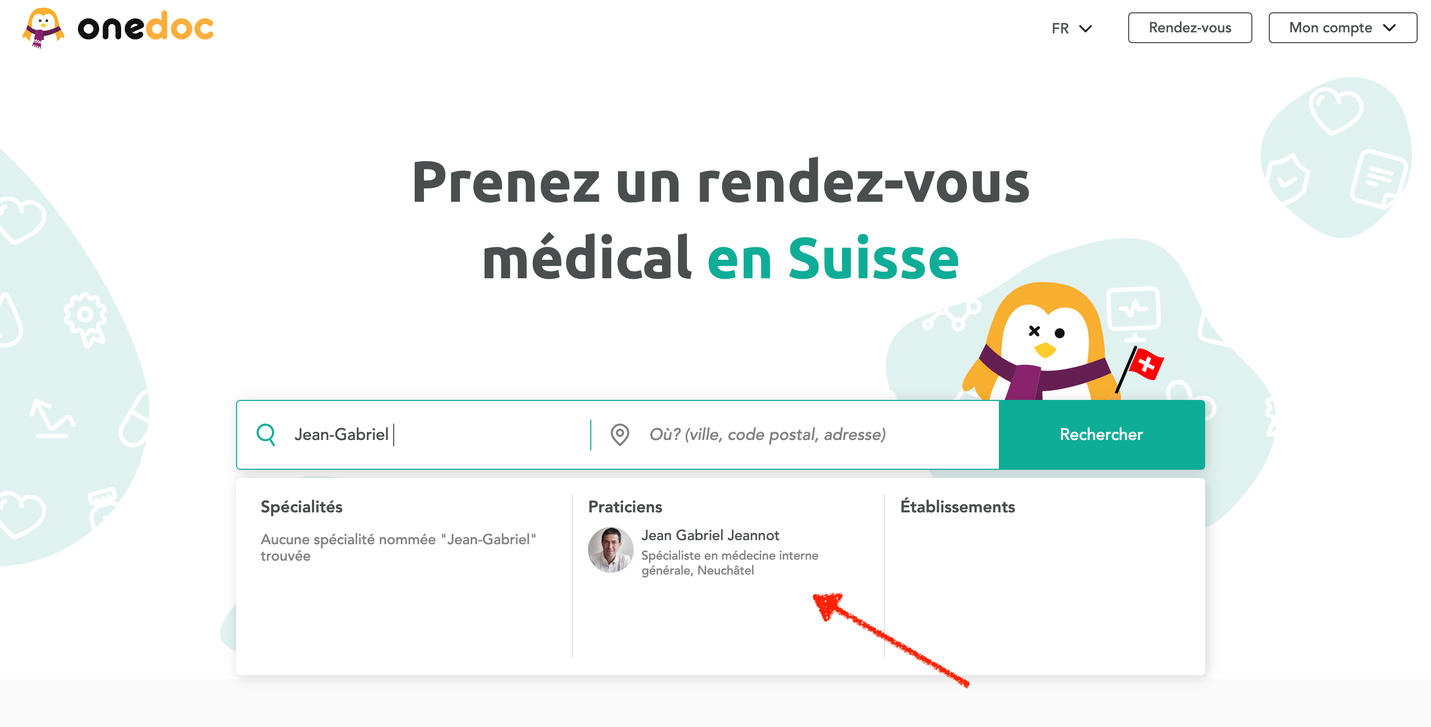 • Lorsque vous êtes sur le moteur de recherche de la page d’accueil, entrez le nom de famille du professionnel de santé ou le nom de son établissement dans le champ de gauche