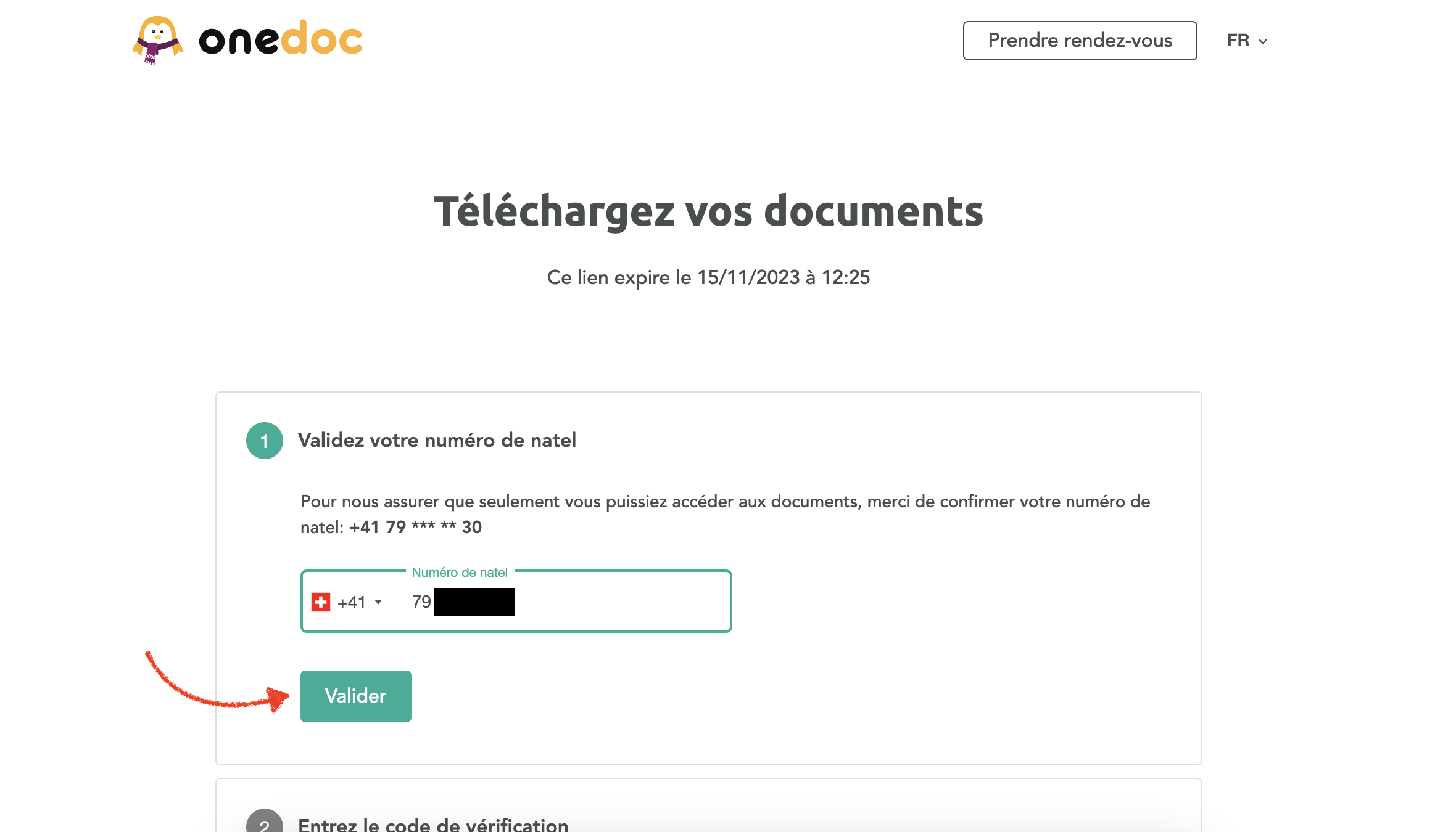 Saisissez votre numéro de téléphone mobile et cliquez sur "Confirmer". Si cela ne fonctionne pas, votre thérapeute pourrait ne pas disposer de votre numéro de téléphone actuel. Contactez directement votre thérapeute (vous pouvez trouver son numéro direct dans votre e-mail, et sur son profil OneDoc).
