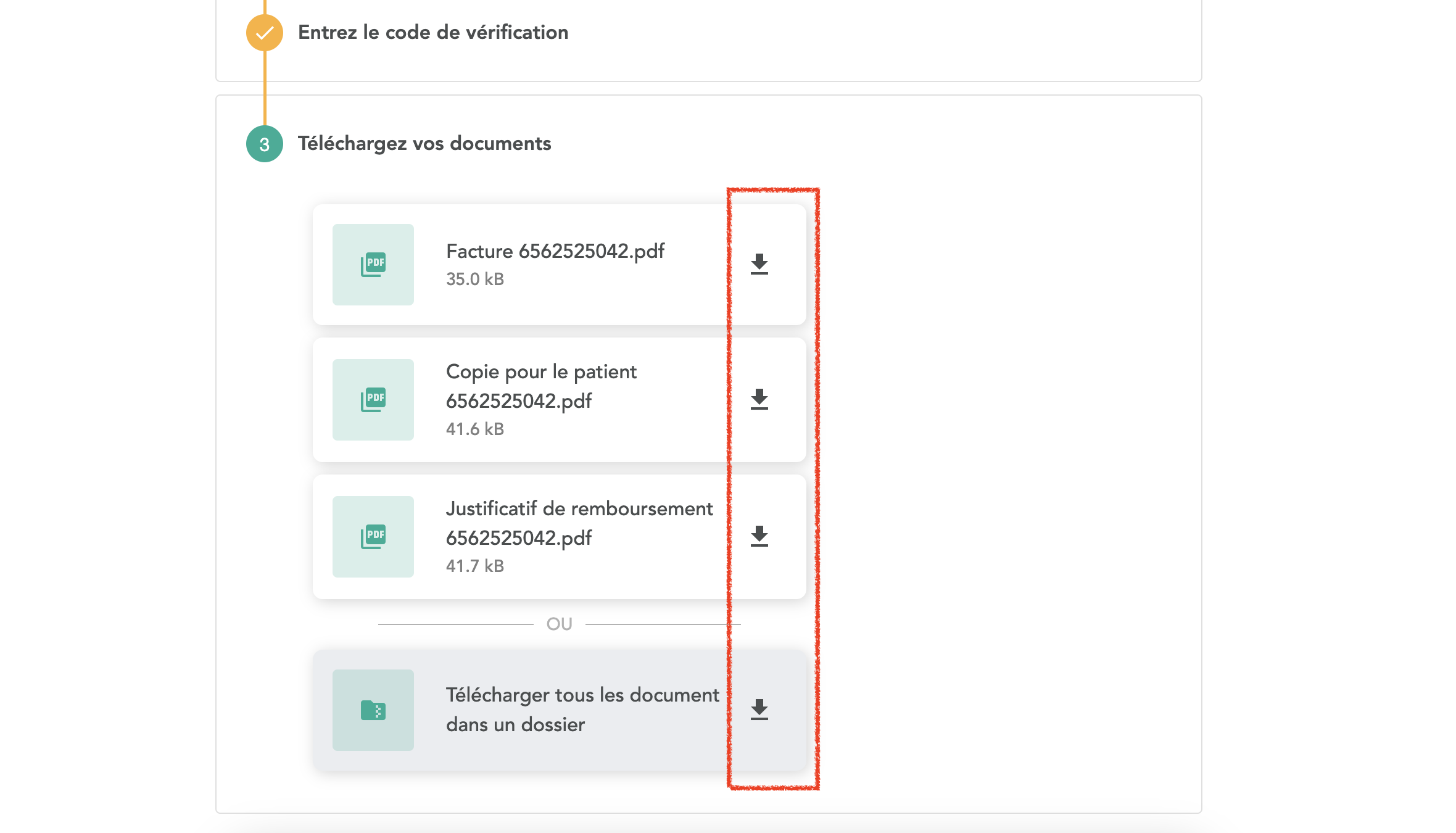 4. Vous verrez maintenant vos documents de facturation. Vous pouvez maintenant télécharger individuellement tous les fichiers en utilisant l'icône de téléchargement ou télécharger le dossier qui regroupe tous vos documents.