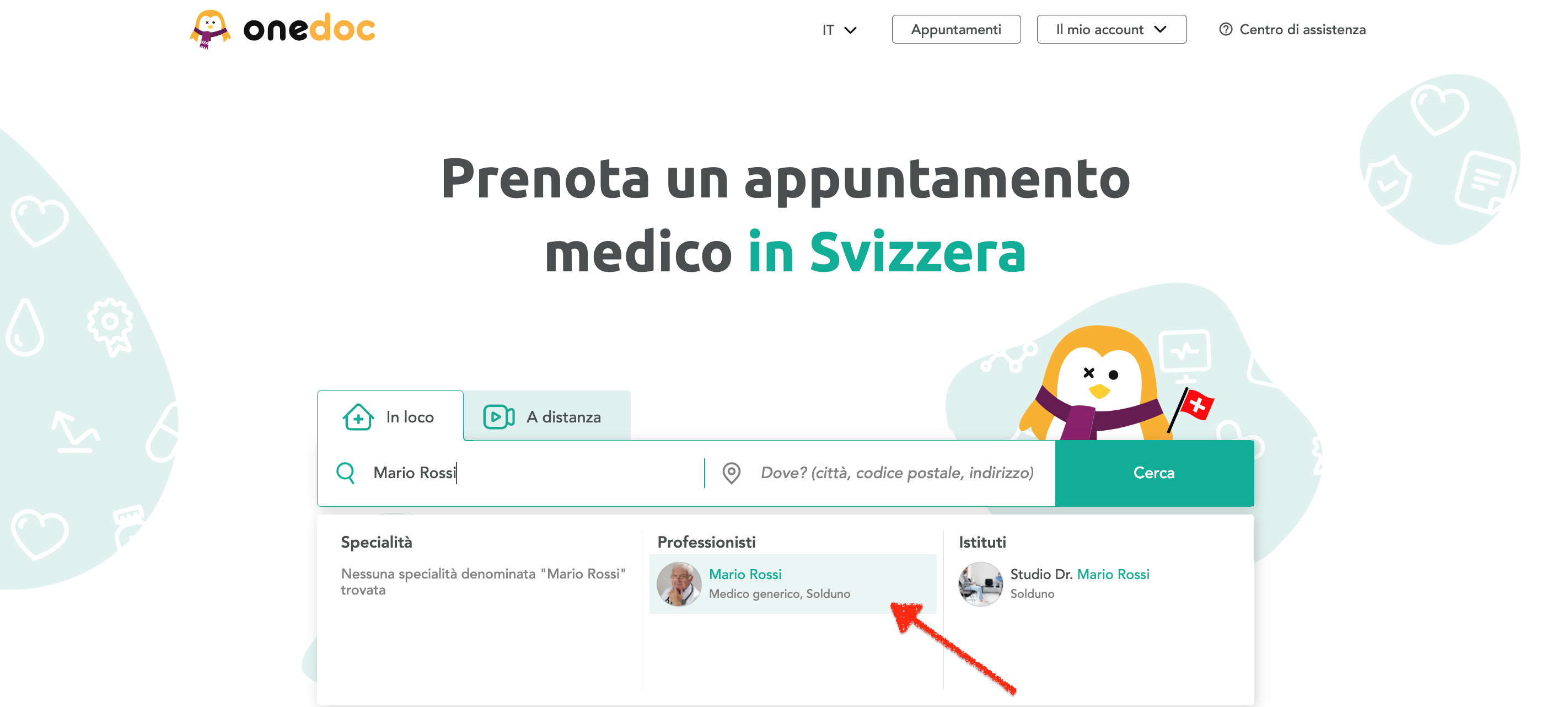 - Quando sei nel motore di ricerca della pagina iniziale, inserisci il nome del professionista sanitario o il nome della sua struttura nel campo a sinistra.